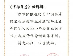 日前,中国药房编辑出版中心报送的“中国药房网卫生健康事业发展70年巡礼专区”入选2019年委管出版单位主题宣传优秀新媒体案例,并获得国家卫生健康委宣传司、中国健康教育中心颁发的“纪念证书”。新中国成立70 年来,我们从积贫积弱、百废待兴中出发,一路披荆斩棘,创造了史无前例的发展奇迹。在这些奇迹中,卫...