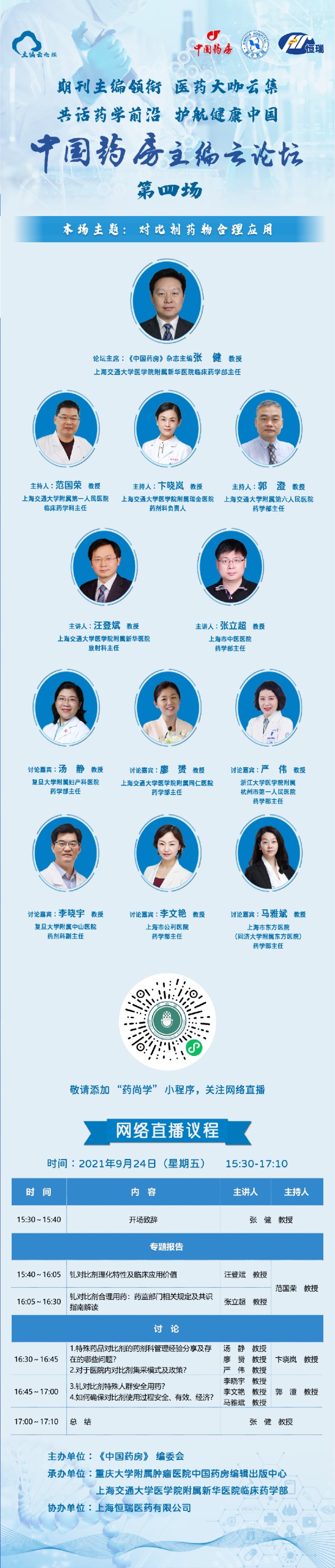 2021年9月24日15:30,我们将开启云论坛『第四场』,由《中国药房》杂志主编、 上海交通大学医学院附属新华医院临床药学部主任张健教授领衔,与业界极具影响力的11位专家学者共话对比剂药物合理应用。敬请期待……