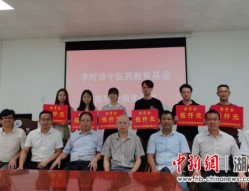 中新网湖北新闻7月17日电 (梅仕明 陈钰)李时珍中医药教育基金会第8次资助与奖学金颁发仪式17日在广州中医药大学举行,广州中医药大学中药药学院院长刘中秋和广州中医药大学教授、博士生导师、深圳市宝安纯中医治疗医院中药学科带头人、李时珍中医药教育基金会理事长梅全喜,为阮清锋、陶盛昌(以上...